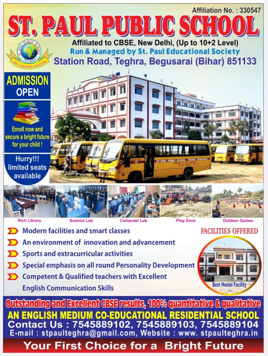 A wonderful vision in the name and form of St. Paul Public School, Teghra, Begusarai, came into existence in 2012 under the patronage of a great philanthropist, after recognizing a genuine need to assist the children of Teghra who were compelled to travel to Begusarai and Patna for quality education because of the lack of a reputed school in Teghra. This is how the beautiful journey started. The school has been serving society successfully for 17 years and has never looked back ever since with Almighty’s care, blessings, and all-time support from all sections in and around Teghra..